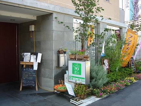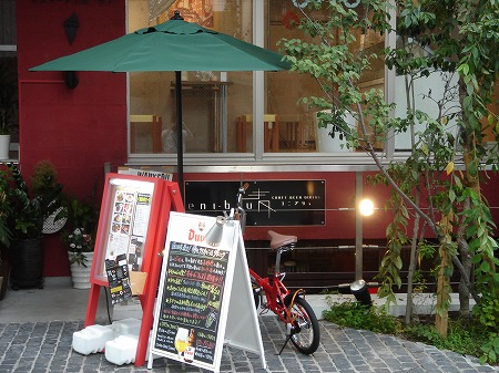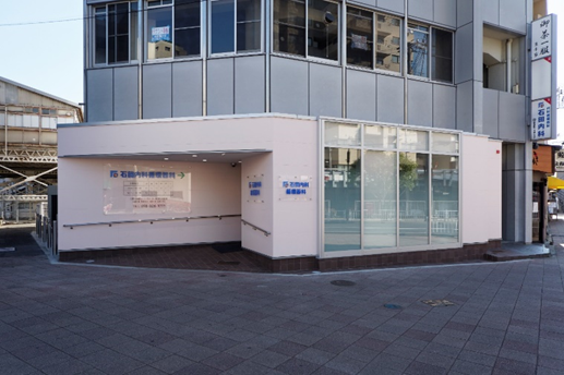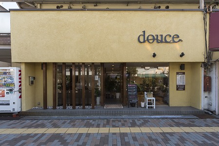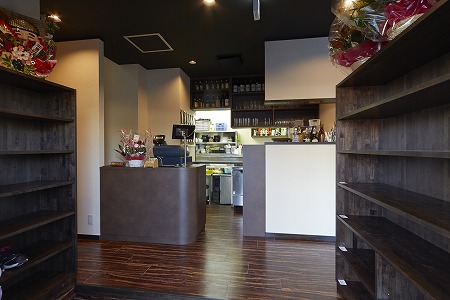 ファサード入口ドアの硝子は透明硝子の下部をすり硝子調に加工し、金文字サインを施し、左側に神戸店で使用していた フェイク玄関を再利用し、自転車も移設しました。また外壁はエイジング加工し昭和30年代のイメージを彷彿させ、 レトロ感のあるタイルを腰壁に貼り付ける等、細部にこだわった設計デザインとなっています。