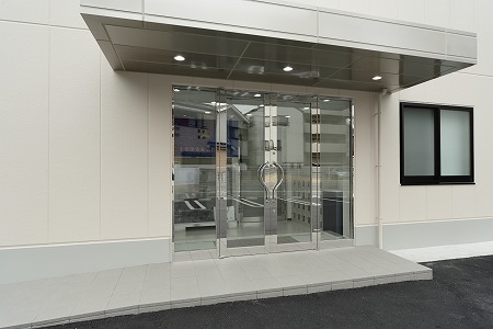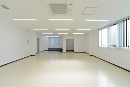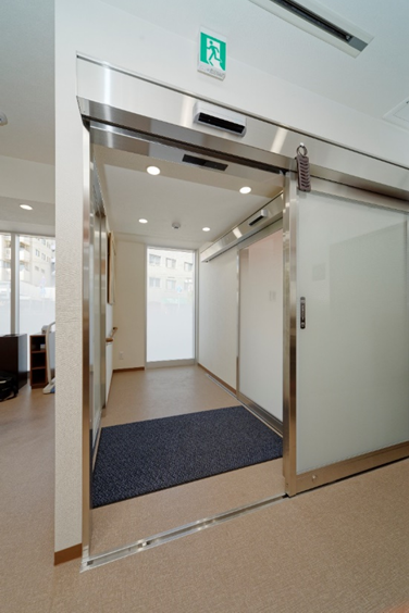 鉄骨造3階建ての1階作業場エリアをオーナー様の休憩スペースに改装した案件です。入口ドアは2枚連動引き戸を取付ています。