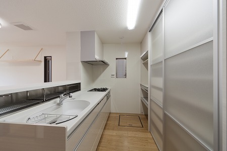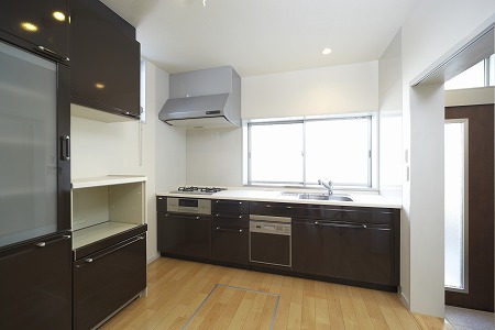 キッチンエリアに通風可能な勝手口を設ける事で、換気効率の改善・採光の確保・生ごみ等の処理が気軽に行える ようにしています。