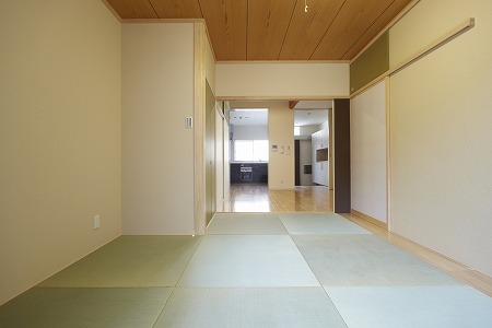 和室の畳は縁なし畳敷きとし、熊本県産の天然イ草を賜与不しています。また全ての引戸を開放すると、玄関・キッチン・ リビング・和室が一体的な空間になります。