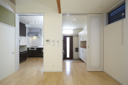 奥様の家事動線を考慮し、キッチンエリアから廊下を経由する事なくサニタリースペースに移動出来る様にしています。