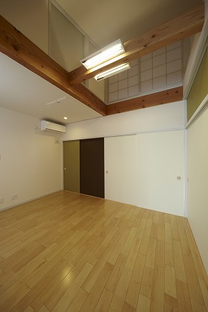 リビング上部の吹き抜け部には構造材の横架材を化粧仕上げにしています。また、ロフト部に光が届く様に吹き抜け部の壁を ワーロン紙を貼り付けた障子にしています。