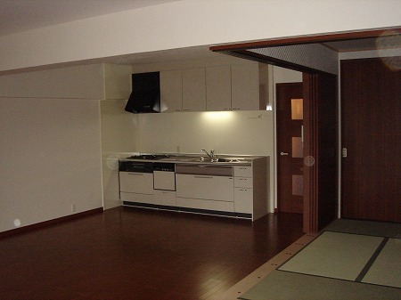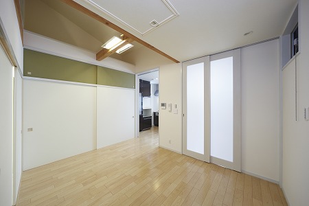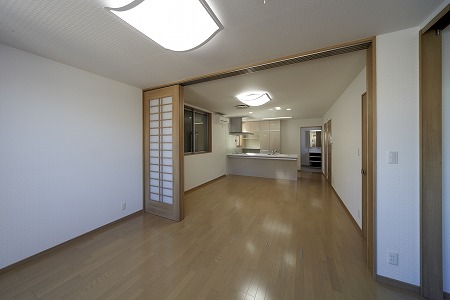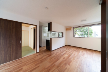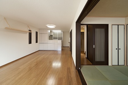 分譲マンション内の改装工事です。LDKスペースと和室スペースは稼働間仕切りで仕切る事で、大きな空間と個室利用 との両立を実現しています。