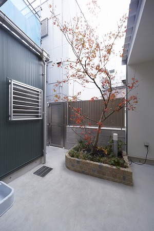 坪庭の花壇はピンコロ石で積み、イロハモミジを植樹しています。