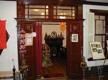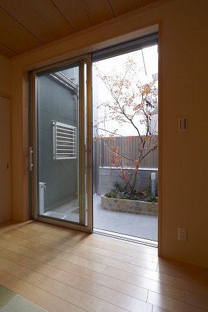 仏間の軸回しもボウズ襖で作成しています。また、和室から坪庭を眺めることが出来る様になっています。
