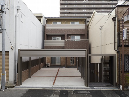 スロープ形状にする事で、玄関から段差なく車に乗車することが出来、中型車と小型車の2台が駐車出来る様にしています。