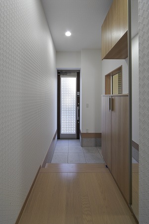 玄関には隣接する階段の下部を利用することで、土足で利用できる収納と、室内側から利用できる収納の2種類を配置し反対の壁にシューズ収納を設け狭小空間を最大限利用しています。