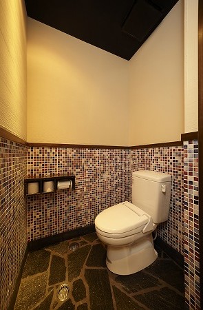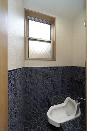 1階のトイレは小便器を併設する事で、水道代の削減に貢献し、全面石貼りにし清掃しやすく清潔な空間にしています。