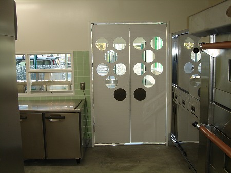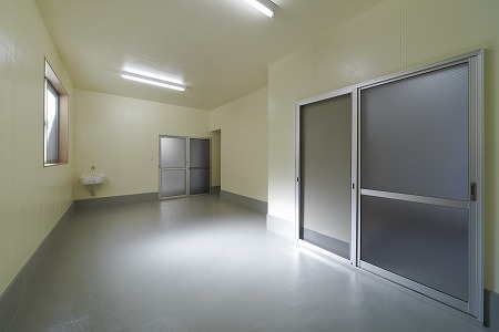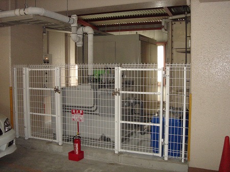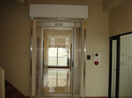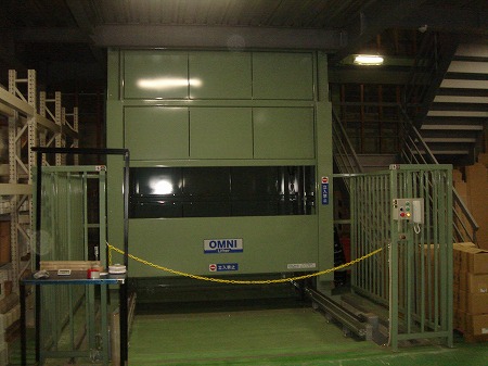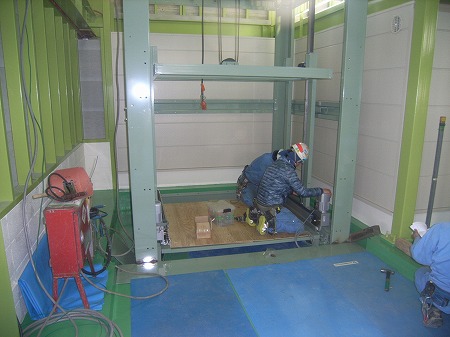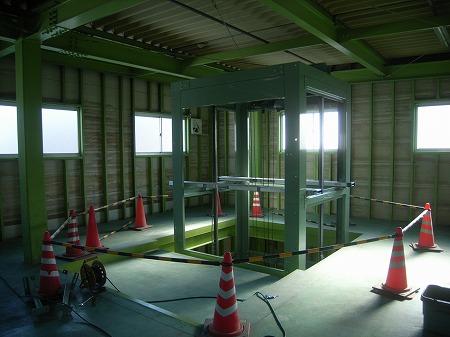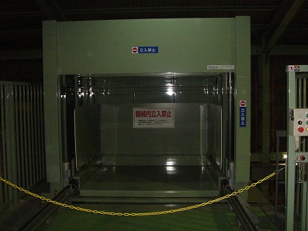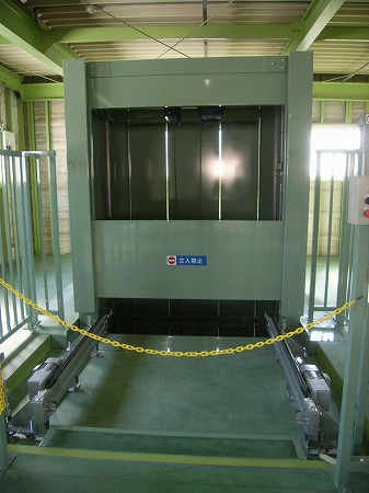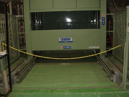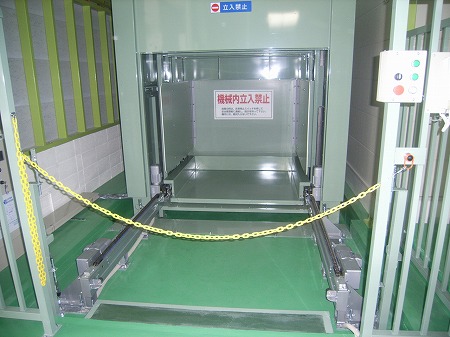 (完成) 1階搬入部です。搬送機稼働時は作業員が昇降路に近づけないようになっています。