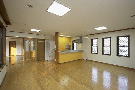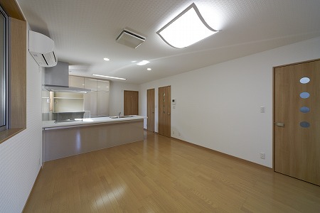 LDKは22帖のオープンキッチン形式とし、木造在来工法でありながら大空間を実現しています。また床暖房を 取付ける事で寒い冬でも効率的に室内を温める事が出来ます。