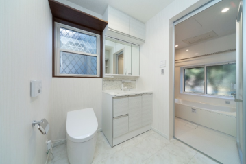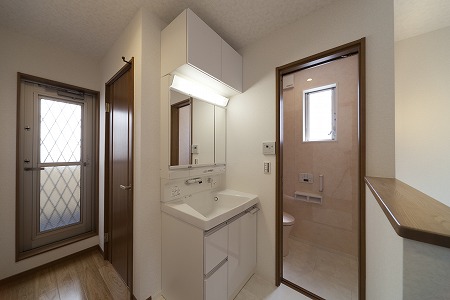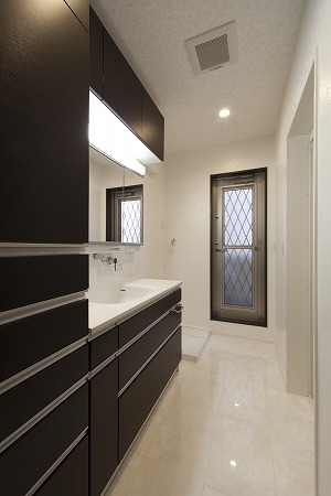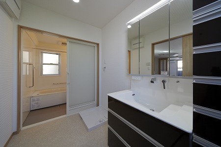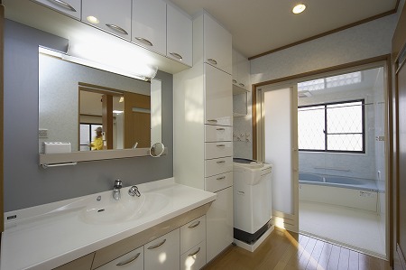 大型の洗面化粧台を設置し、親子2人同時に使用することが出来る様にし、お風呂の残り湯を再利用しやすくする 為に、循環ポンプ及び配管を埋め込み効率的に家事が出来る様に設計しています。