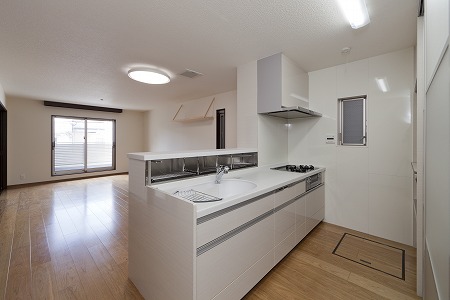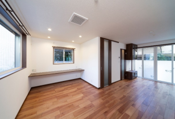 LDKにカウンターを設ける事で、子供たちが共用で学習できるスペースを確保しています。また、天井面に換気扇を設け家族団らんでの食事での排煙効率を上げています。