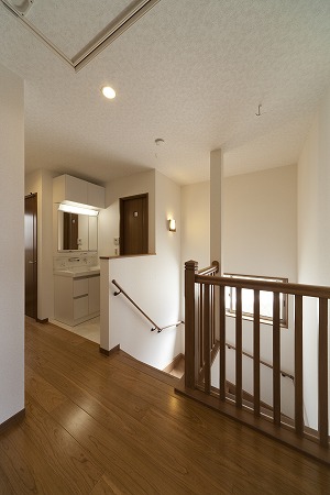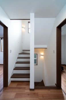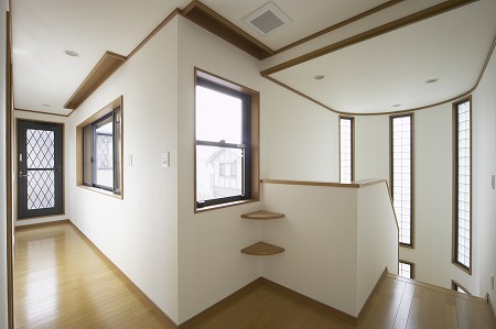 階段から2階廊下には多くの開口部から明るい光が差し込み照明を点灯する事なく十分な照度を確保し、階段は ガラスブロックを採用する事で、プライバシーを確保しながら、採光を取り入れる様に設計デザインしています。