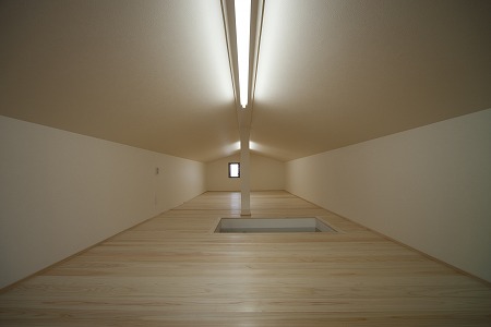 階段室の上部に小さな収納スペースを設け、さらにその上にロフトを創り、空間を有効に利用しています。