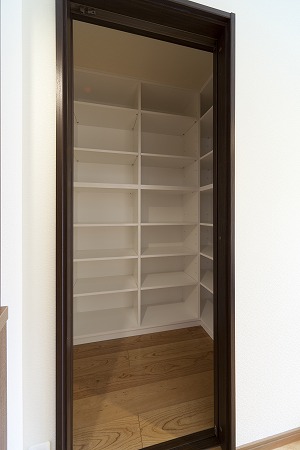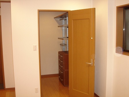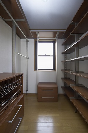 主寝室に併設したウォークインクローゼットの内部には全面に収納棚を設け大容量の衣類や荷物を収納出来る様に しています。