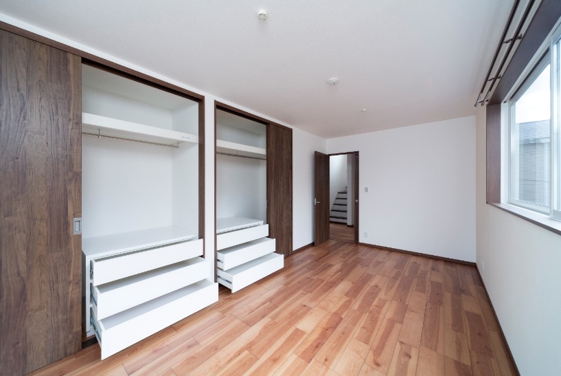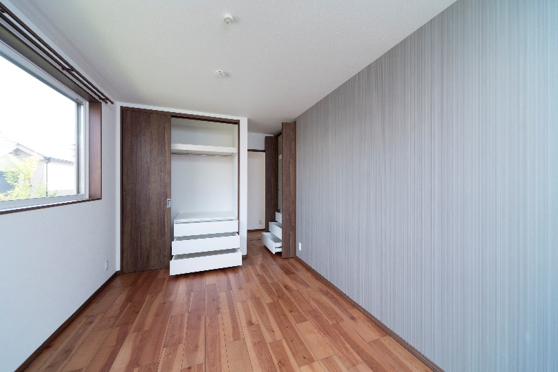 主寝室は壁紙にアクセントを加える事で、シックな空間を演出し、夫婦別々の収納スペースを確保しています。