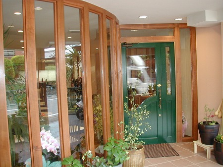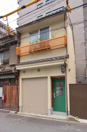 防火地域の為、グリーンの木製建具の前面にはスチールシャッターを取付け、2階の手摺はイエローで再塗装し、外壁はモルタル下地 の上にエスタコウォールと珪砂を練り合わせし塗り付けています。