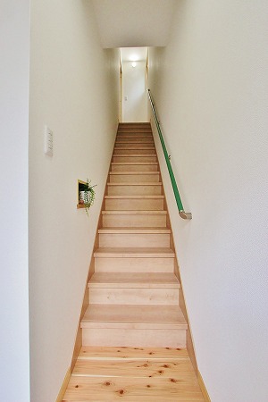 階段室には玄関ドアと同色の手摺を取付けています。