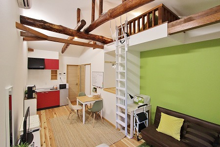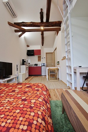 2階はワンルーム形式とし、コンパクトキッチンを設置しています。また天井を撤去し小屋梁を化粧仕上げする事で、 広がりのある空間にしています。