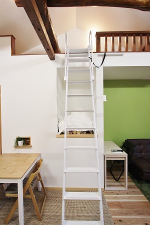 壁面に取り付けた梯子を取り外し、斜めに架ける事でロフトへ上がる事ができます。