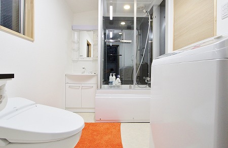 ガラス張りのシャワールームを設置する事で、コンパクトなサニタリースペースに全ての機能を集約設置しても、圧迫感の ない空間にしています。