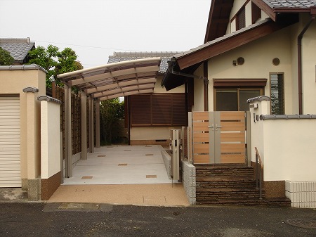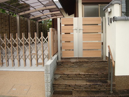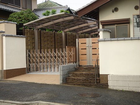 駐車スペースを確保する為、数寄屋門を撤去し、アコーディオン門扉と親子開き門扉を取付ました。