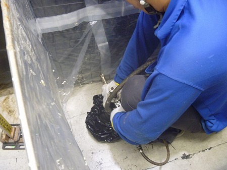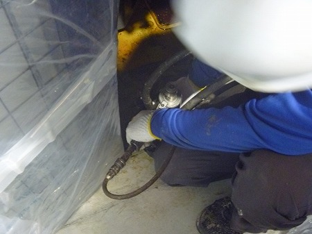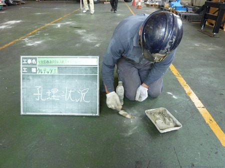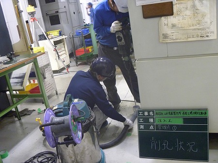 施工中 掘削状況  床の傾きを計測後、修正箇所にドリルにて注入孔を開けています。