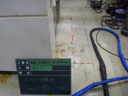施工中 特殊膨脹樹脂注入状況-管理点①   特殊膨脹樹脂をコントロールしながら注入する事で、樹脂の膨張力で 地盤を締固め、さらに床を上に押し上げます。