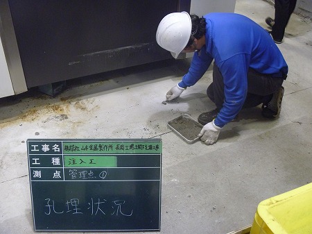 施工中 孔埋状況-管理点②   樹脂注入後に掘削箇所をモルタルにて閉塞します。