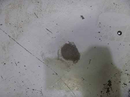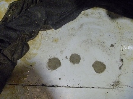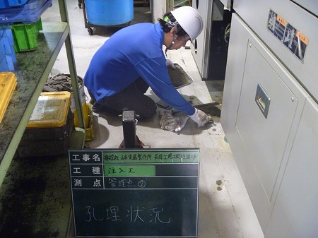 施工中 掘削状況-管理点①   床の傾きを計測後、修正箇所にドリルにて注入孔を開けています。