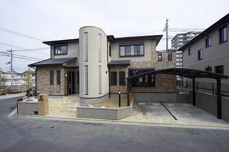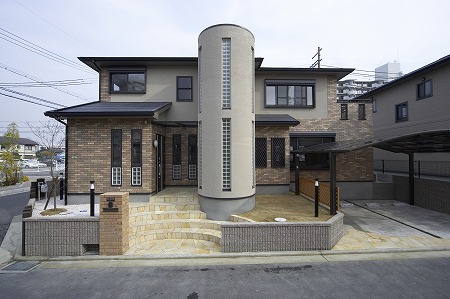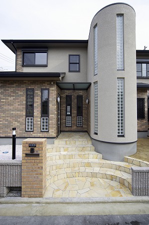 突き出したアール部は階段になっています。柱モジュールを960㎜に設定する事でスケール感の有る外観になっています。