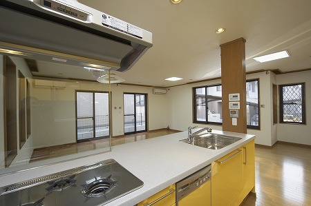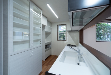 ガスコンロ前面には耐熱硝子を取付ける事で、油煙等がリビング側に流れ込まない様にし、効率よく排気しながらも、 オープンキッチン本来の開放感を即なわない様にしています。