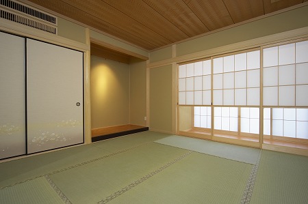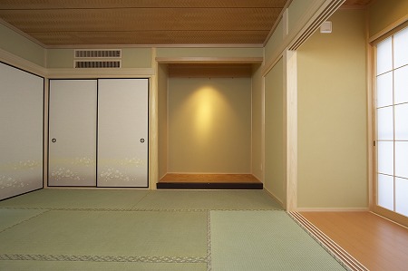 和室の畳表は熊本県産の天然イ草を使用しており、空調設備を壁に埋め込む事で趣のある空間にしています。