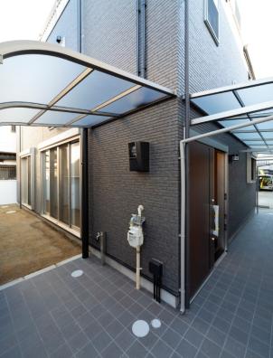 玄関ドアは開放時に内部が見えない様に東向きにし、少し奥に設計していますが、明るさを確保する為、硝子の庇にしています。