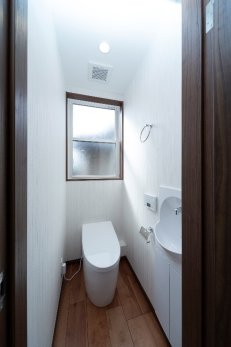 2階のトイレは独立して設置し、タンクレス式便器、埋込式の手洗器を採用し狭小空間を最大限利用しています。