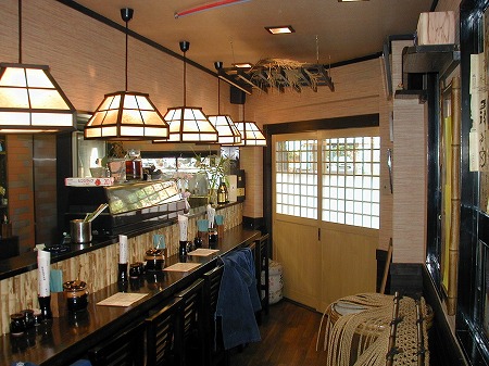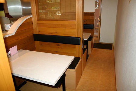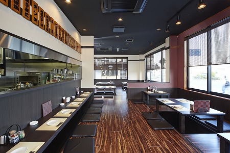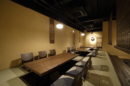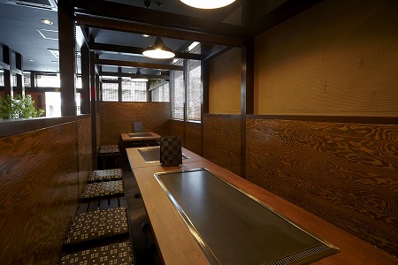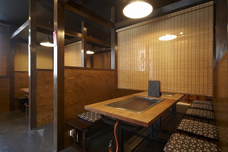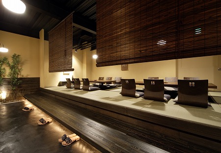 テーブル席の反対側には座敷がありますが、片引き吊戸に和紙調のシートを貼り、吊り下げたテントカーテンを閉める事で、 座敷とテーブル席のお客様同士の視線が交差しない様に設計しています。