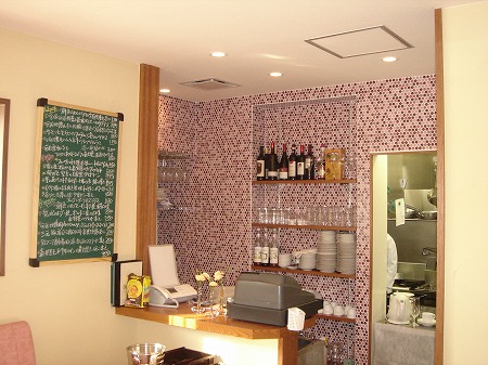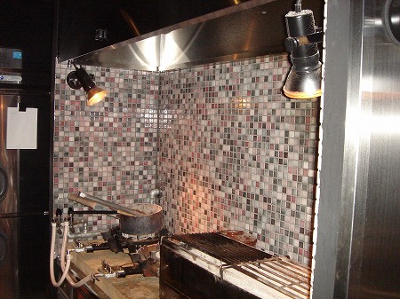 カウンター席は焼き台の前に設置し、マスターが調理する串焼きを耐熱ガラス越しに臨場感たっぷり味わえるようにし、 レトロ感を創り出ため、丸いモザイクタイルをオーバーグランドジョイントで仕上げています。