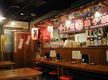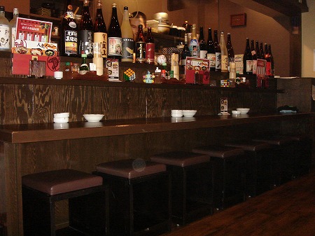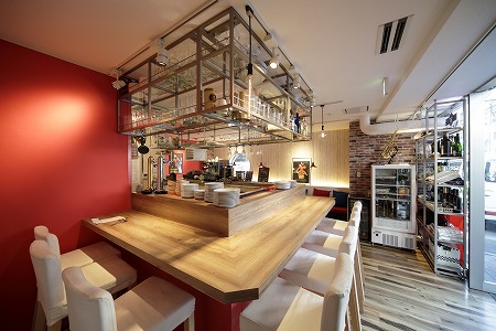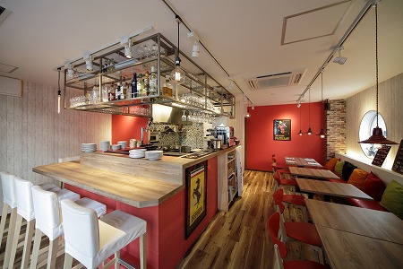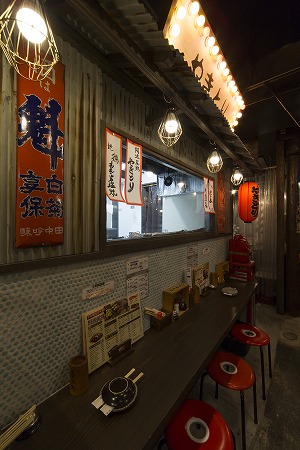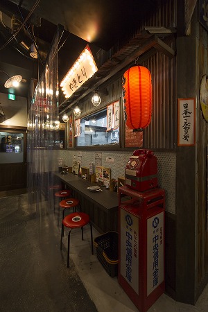 カウンター上部は下屋を設け、工事用の裸電球を吊り下げ赤い丸椅子を置き、赤ちょうちん、赤電話もも配置し、 上部にはエイジング加工した電球看板を取付、まるで外の屋台で飲んでいるかのように錯覚する様なデザインに しており、外部からの冷気を防ぐテントカーテンも雰囲気創りに一役買っています。