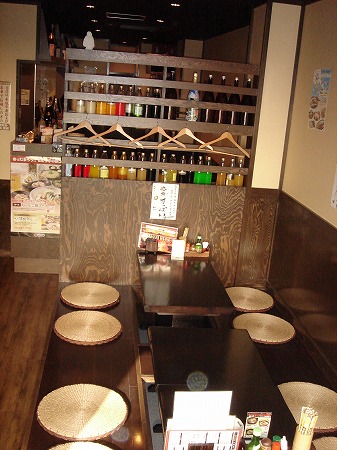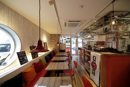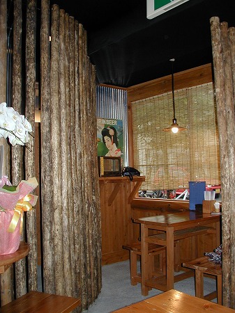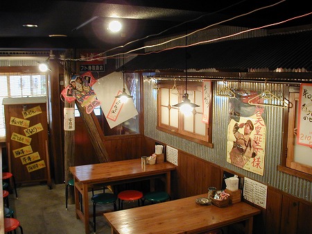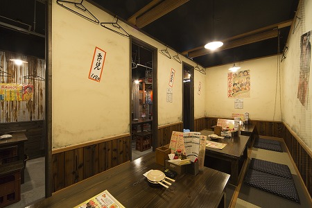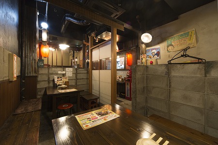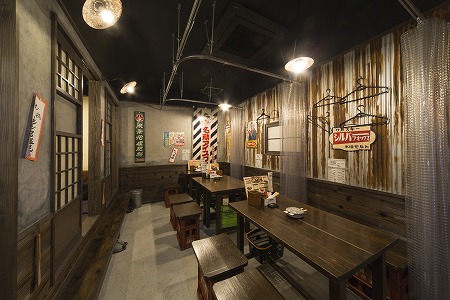 カウンターを通り過ぎ左側には屋台のテーブル席が配置され壁はブリキの波板に錆エイジング塗装を施し、椅子は 焼酎ケースを加工しレトロ感を演出しています。