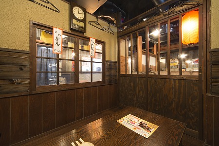 カウンター裏は完全個室になっており、昭和30年代の居酒屋で飲んでいるイメージで設計し、窓から外のレトロ感が 伝わる様にしています。