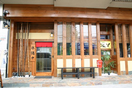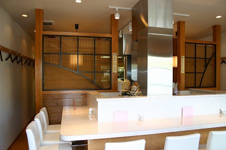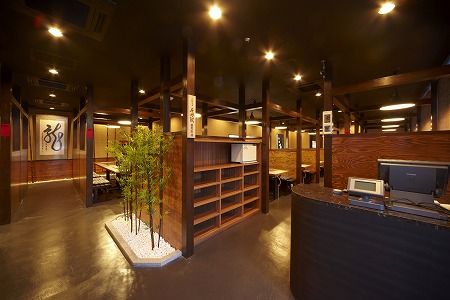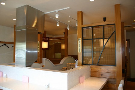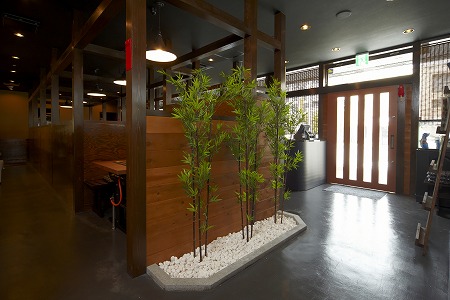 マンション1階テナント部にお好み焼き店を新規出店した案件です。豊岡の古民家から採取した材料を多数使用し、見えす ぎずみえなさすぎずを考慮し柱・硝子を多く使用しています。