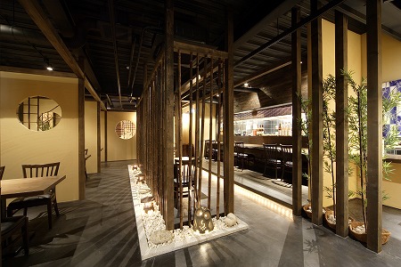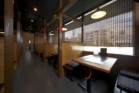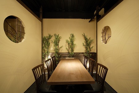 窓側のテーブル席には竹簾を設置しプライバシーとナチュラルライティング及び夜間の外部照明の補助機能も兼ね 備えた設計にしています。