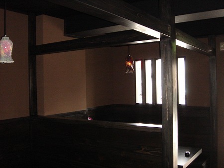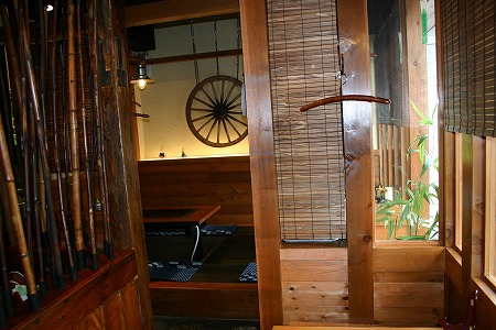 座敷には間接照明を設置し、狭い空間を少しでも広く・明るく感じとれるようにしています。また、壁面には古民家から採取 した木製の車輪を飾っています。