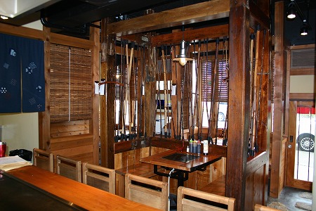 ホール中央席は古材のケヤキや藁葺屋根がある古民家から採取できる貴重な煤竹を建て込み、独立した感じを保ちながら、一 体感のある空間にしています。カウンターやテーブル(鉄板埋込)は古材のケヤキを使用しています。