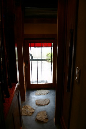 通路には豊岡の玄武岩を飛び石の様に配置し、周りはカラークリート(黒色)で仕上げることで、古びた感じを創りだして います。