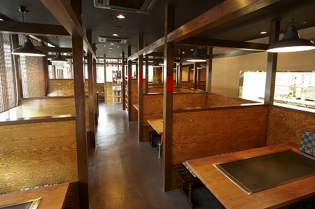 元コンビニ跡の大空間をそのままに半個室形式のテーブル席を配置し、着席時には視線を遮る高さの腰壁として 個室感を出し、かつ全体のボリューム感を損なわないような高さ設計をしています。